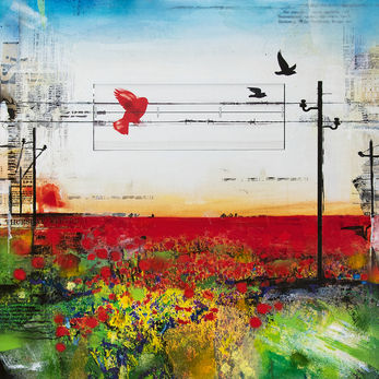 Cette œuvre examine la transition du vol dissonant de corbeaux noirs à l'émergence d'une unité colorée, symbolisant comment les moments de beauté peuvent transformer les perspectives et créer une harmonie inattendue au cœur de la routine.